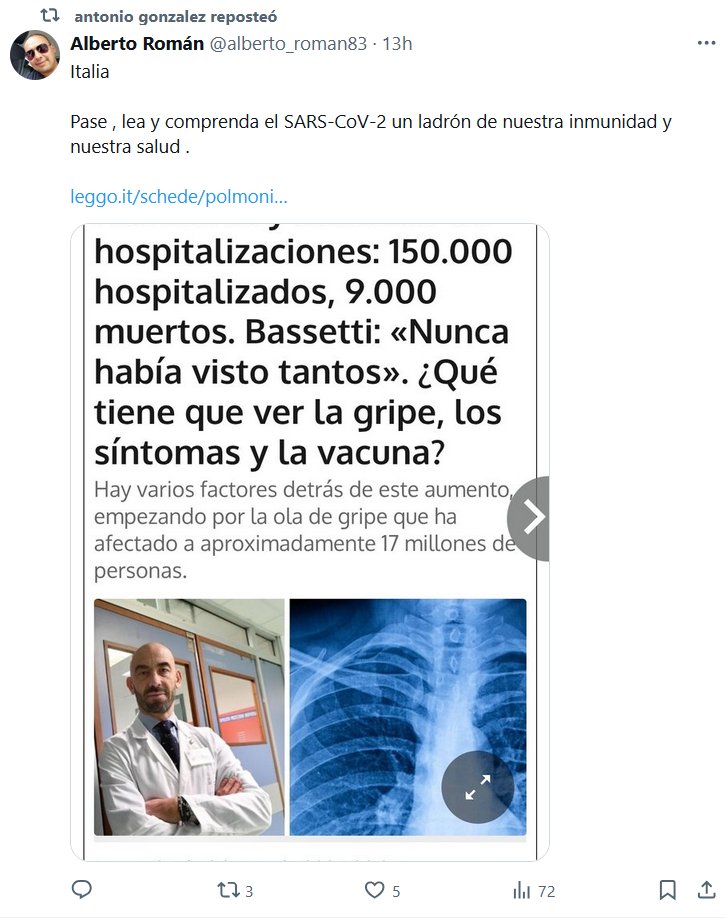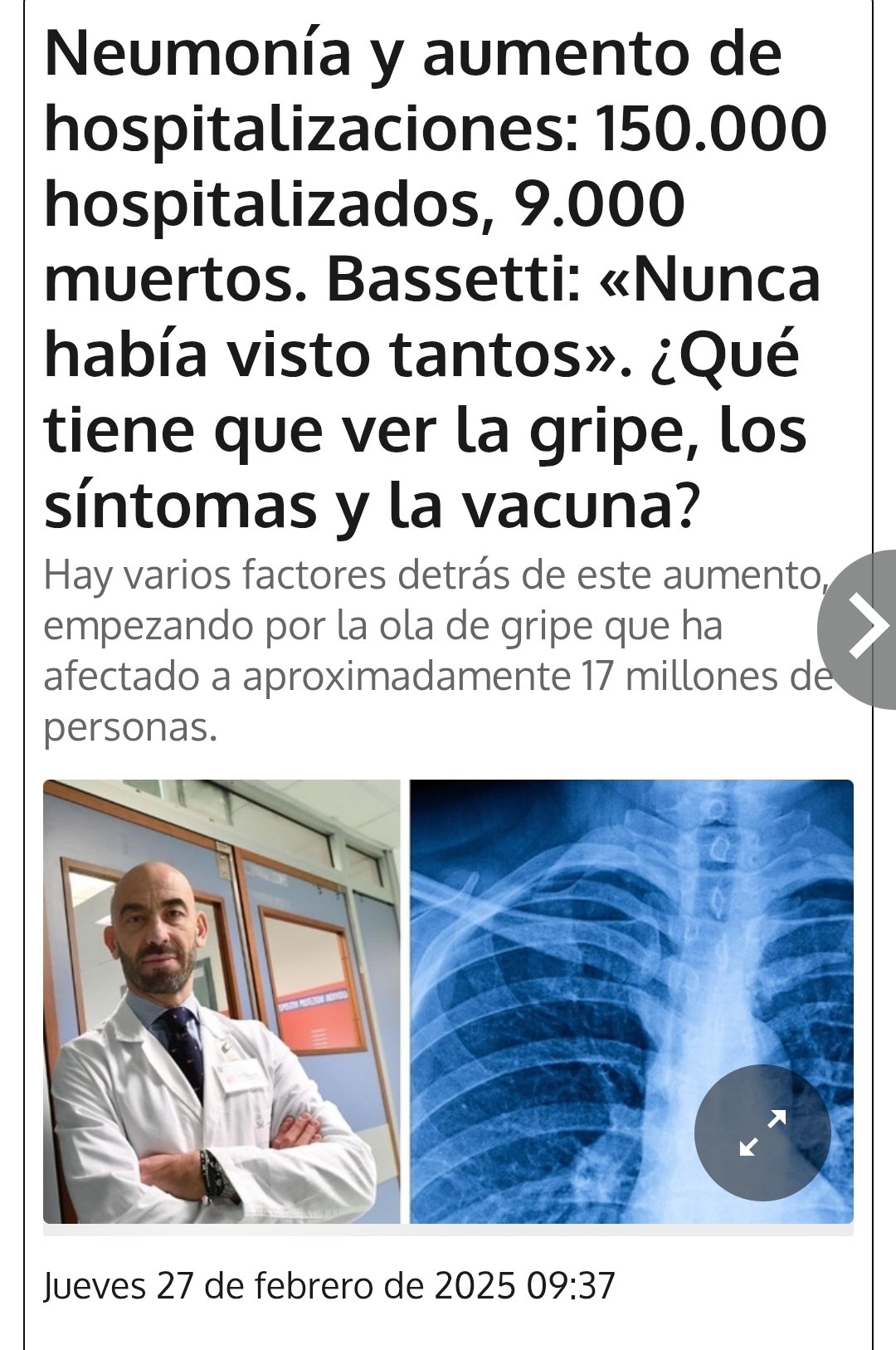 NODIGAMOSCOVID Y POSTCOVID HACEN ESTRAGOS! 27 de febrero de 2025 «Neumonía y aumento de hospitalizaciones:150.000 hospitalizados, 9.000 muertos. Bassetti: ‘Nunca había visto tantos’ ¿Qué tiene que ver la gripe, los síntoma y la vacuna?»