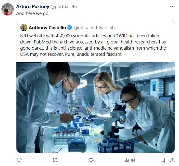 OMERTÁ COVID: LA MAFIA DESAPARECIENDO PRUEBAS (EN INGLÉS) El sitio web del NIH, con 430.000 artículos científicos sobre la COVID-19, ha sido eliminado. PubMed, el archivo al que acceden todos los investigadores de salud del mundo, ha desaparecido… Esto es vandalismo anticientífico y antimedicina del que Estados Unidos quizá no se recupere. Fascismo puro y duro.