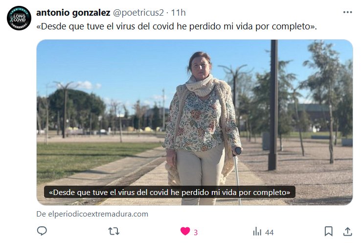 TESTIMONIOS «Desde que tuve el virus del covid he perdido mi vida por completo». Posted on marzo 4, 2025 por coronado https://www.elperiodicoextremadura.com/extremadura/2025/03/03/tuve-virus-covid-he-perdido-114871420.html?utm_source=twitter&utm_medium=social&utm_campaign=btn-share