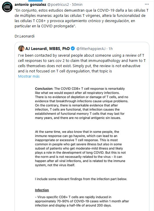 COVID≠GRIPE -> COVID≈SIDA «En conjunto, estos estudios demuestran que la COVID-19 daña a las células T de múltiples maneras: agota las células T vírgenes, altera la funcionalidad de las células T CD8+ y provoca agotamiento crónico y desregulación, en particular en la COVID prolongada». Dr.Leonardi