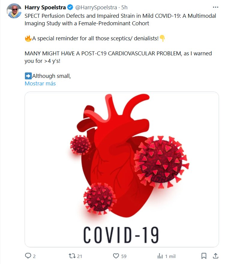 EN INGLÉS Harry Spoelstra @HarrySpoelstra Defectos de perfusión SPECT y alteración de la tensión en pacientes con COVID-19 leve: un estudio de imágenes multimodales con una cohorte predominantemente femenina 🔥¡Un recordatorio especial para todos aquellos escépticos/negacionistas!👇 ¡MUCHOS PODRÍAN TENER UN PROBLEMA CARDIOVASCULAR POST-C19, como les advertí hace más de 4 años!