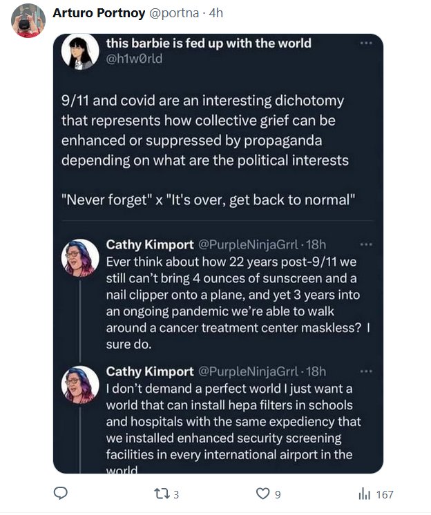 Cathy Kimport @PurpleNinjaGrrl - No exijo un mundo perfecto, solo quiero un mundo que pueda instalar filtros HEPA en escuelas y hospitales con la misma rapidez con la que instalamos instalaciones de control de seguridad mejoradas en todos los aeropuertos internacionales del mundo