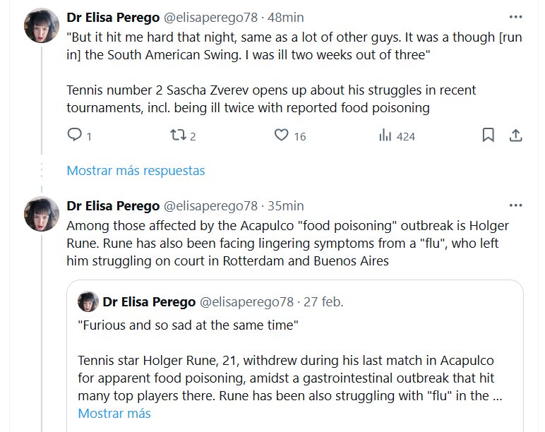 INUSUALES ENFERMEDADES EN LA ERA COVID (EN INGLÉS) «Pero esa noche me afectó mucho, como a muchos otros. Fue una etapa difícil en la gira sudamericana. Estuve enfermo dos semanas de cada tres» El número 2 del tenis, Sascha Zverev, habla de sus problemas en los torneos recientes, incluida la enfermedad que sufrió dos veces por intoxicación alimentaria.