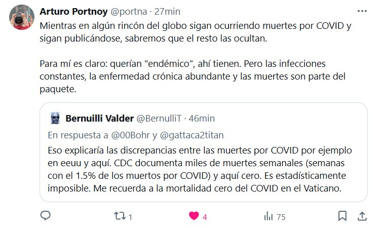 VERDAD ANTIVIRAL Arturo Portnoy @portna · Mientras en algún rincón del globo sigan ocurriendo muertes por COVID y sigan publicándose, sabremos que el resto las ocultan. Para mí es claro: querían «endémico», ahí tienen. Pero las infecciones constantes, la enfermedad crónica abundante y las muertes son parte del paquete.