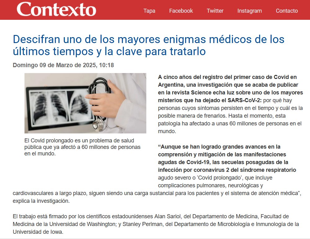 A cinco años del registro del primer caso de Covid en Argentina, una investigación que se acaba de publicar en la revista Science echa luz sobre uno de los mayores misterios que ha dejado el SARS-CoV-2: por qué hay personas cuyos síntomas persisten en el tiempo y cuál es la posible manera de frenarlos. Hasta el momento, esta patología ha afectado a unas 60 millones de personas en el mundo.