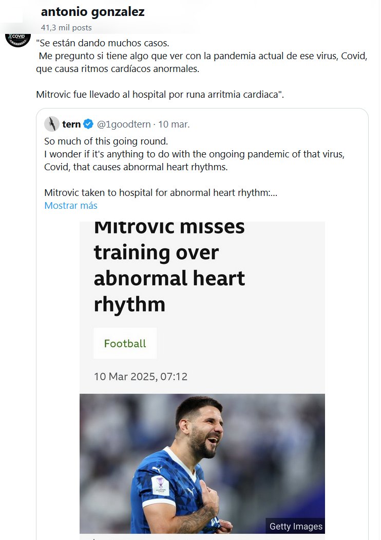 COMO EL KUN AGÜERO «Se están dando muchos casos. Me pregunto si tiene algo que ver con la pandemia actual de ese virus, Covid, que causa ritmos cardíacos anormales. Mitrovic fue llevado al hospital por runa arritmia cardiaca»