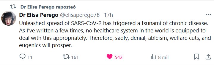 Dra. Elisa Perego @elisaperego78 · La propagación desatada del SARS-CoV-2 ha desencadenado un tsunami de enfermedades crónicas. Como he escrito varias veces, ningún sistema sanitario del mundo está preparado para afrontar esto adecuadamente. Por lo tanto, lamentablemente, la negación, el capacitismo, los recortes sociales y la eugenesia prosperarán.