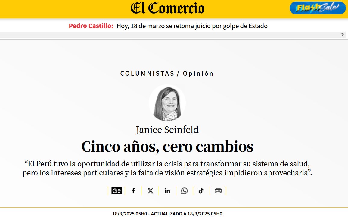 MUERTE DE LA SALUD PÚBLICA EN TODO EL MUNDO Cinco años, cero cambios “El Perú tuvo la oportunidad de utilizar la crisis para transformar su sistema de salud, pero los intereses particulares y la falta de visión estratégica impidieron aprovecharla”