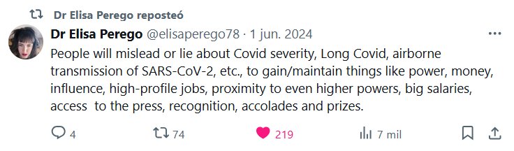 Dra. Elisa Perego @elisaperego78 · La gente engaña o miente sobre la gravedad de la COVID-19, la COVID-19 persistente, la transmisión aérea del SARS-CoV-2, etc., para obtener o mantener cosas como poder, dinero, influencia, puestos de alto perfil, proximidad a poderes aún mayores, altos salarios, acceso a la prensa, reconocimiento, galardones y premios.