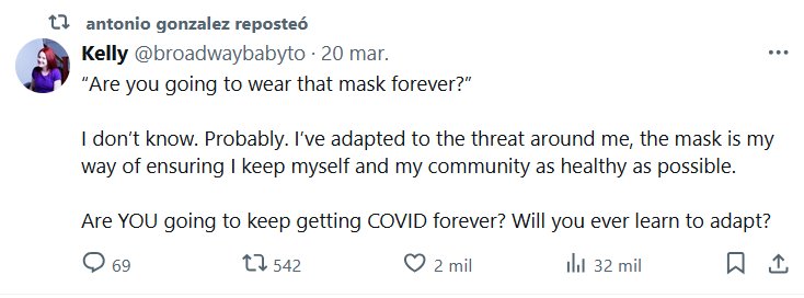 ESCUCHO VOCES ¿Vas a usar esa mascarilla para siempre? No lo sé. Probablemente. Me he adaptado a la amenaza que me rodea; la mascarilla es mi forma de asegurarme de mantenerme a mí misma y a mi comunidad lo más sanos posible. ¿Vas a seguir contagiándote de COVID para siempre? ¿Aprenderás alguna vez a adaptarte?