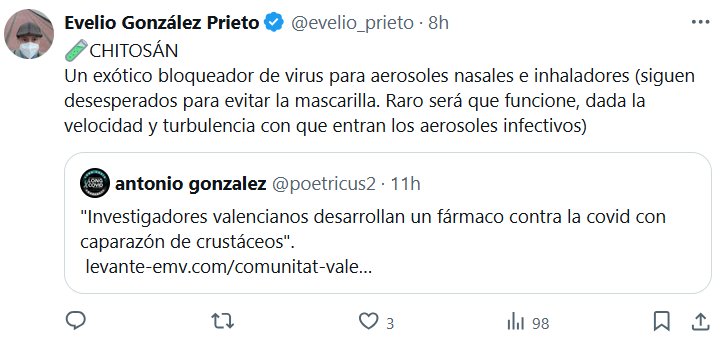 Evelio González Prieto @evelio_prieto · 8h 🧪CHITOSÁN Un exótico bloqueador de virus para aerosoles nasales e inhaladores (siguen desesperados para evitar la mascarilla. Raro será que funcione, dada la velocidad y turbulencia con que entran los aerosoles infectivos)