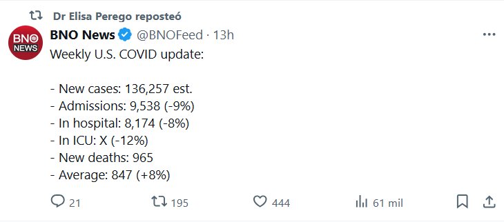 EEUU AHORA: 965 MUERTOS COVID ESTA SEMANA (PROYECCIÓN DE 50.000 MUERTOS ANUALES) Dr Elisa Perego reposteó BNO News @BNOFeed · 13h Weekly U.S. COVID update: – New cases: 136,257 est. – Admissions: 9,538 (-9%) – In hospital: 8,174 (-8%) – In ICU: X (-12%) – New deaths: 965 – Average: 847 (+8%) Posted on marzo 24, 2025 por coronado