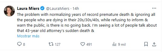 El problema de normalizar años de récords de muerte prematura e ignorar a todas las personas que mueren entre los 20, 30 y 40 años, mientras se niegan a informar y advertir al público, es que no hay vuelta atrás. Veo a mucha gente hablar de la muerte repentina de esa abogada de 43 años y sugerir que debe ser un acto ilícito debido a su edad. Todos están MUY desinformados y desconocen por completo que los jóvenes han estado muriendo en cifras récord durante años. Acabo de asistir al funeral de un familiar que murió mientras dormía a los 43 años, y mi primo de 50 años murió mientras dormía una semana después. En mi círculo, muere más gente ahora que en 2020. La esperanza de vida en Estados Unidos se redujo drásticamente y no ha hecho más que disminuir. Reconocimos que la *COVID* es responsable del récord de muerte prematura en 2021-2022, pero para 2023 ya fingíamos que era un misterio desconcertante. Cuando supimos que estos aumentos repentinos de muertes por ataques cardíacos y accidentes cerebrovasculares en adultos jóvenes y niños coinciden con los aumentos de COVID-19, eliminamos las pruebas y los datos, y pusimos fin a la emergencia de salud pública. Ahora que ha pasado tanto tiempo, las muertes en público de personas de todas las edades se han convertido en nuestra nueva norma, y lamentablemente, la gente seguirá fingiendo que esto es normal hasta que les llegue el turno de ser recordados.