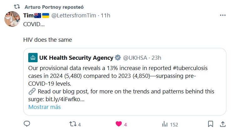 COVID… El VIH hace lo mismo: Agencia de Seguridad Sanitaria del Reino Unido @UKHSA Nuestros datos provisionales revelan un aumento del 13 % en los casos de #tuberculosis notificados en 2024 (5480) en comparación con 2023 (4850), superando los niveles previos a la COVID-19