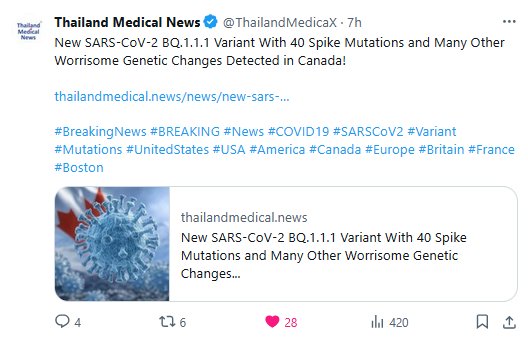 Thailand Medical News @ThailandMedicaX ¡Se detectó en Canadá una nueva variante del SARS-CoV-2 BQ.1.1.1 con 40 mutaciones de la proteína espícula y muchos otros cambios genéticos preocupantes!