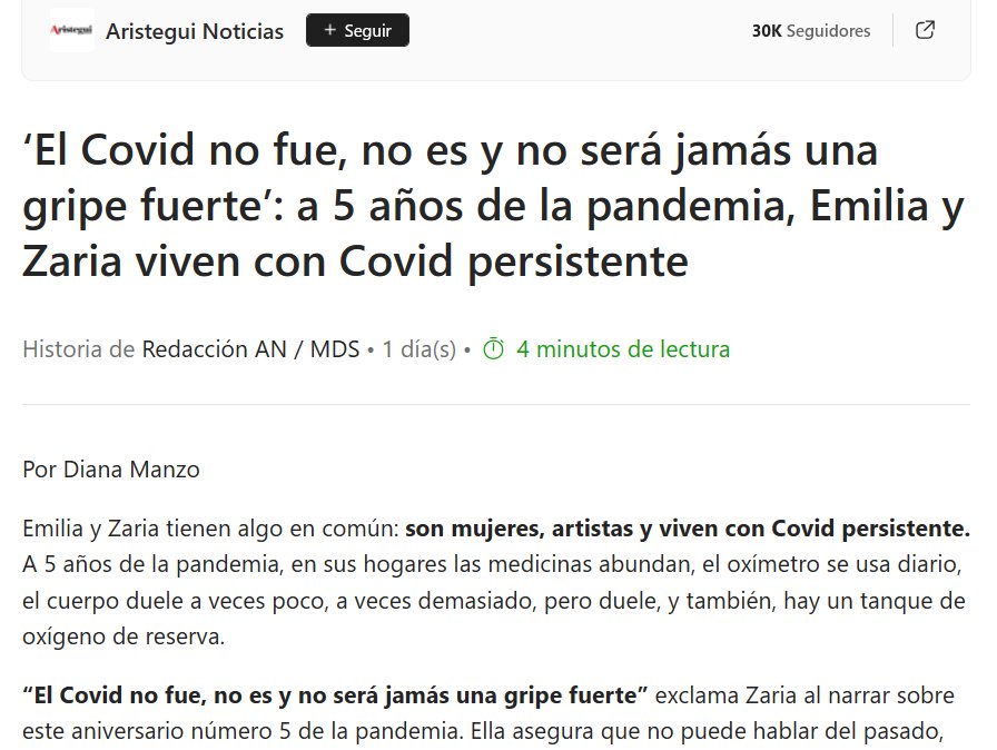 NO ERA GRIPECITA Y NO ERA LEVE ‘El Covid no fue, no es y no será jamás una gripe fuerte’: a 5 años de la pandemia, Emilia y Zaria viven con Covid persistente Posted on marzo 27, 2025 por coronado https://www.msn.com/es-mx/salud/enfermedades-y-condiciones-m%C3%A9dicas/el-covid-no-fue-no-es-y-no-ser%C3%A1-jam%C3%A1s-una-gripe-fuerte-a-5-a%C3%B1os-de-la-pandemia-emilia-y-zaria-viven-con-covid-persistente/ar-AA1BGAlc