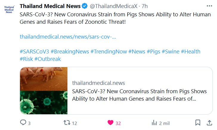 ¿SARS-CoV-3? ¡Una nueva cepa de coronavirus de origen porcino muestra capacidad para alterar genes humanos y genera temores de una amenaza zoonótica! Posted on marzo 27, 2025 por coronado https://www.thailandmedical.news/news/sars-cov-3-new-coronavirus-strain-from-pigs-shows-ability-to-alter-human-genes-and-raises-fears-of-zoonotic-threat