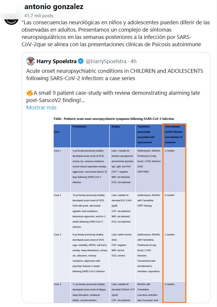 Las consecuencias neurológicas en niños y adolescentes pueden diferir de las observadas en adultos. Presentamos un complejo de síntomas neuropsiquiátricos en las semanas posteriores a la infección por SARS-CoV-2que se alinea con las presentaciones clínicas de Psicosis autoinmune