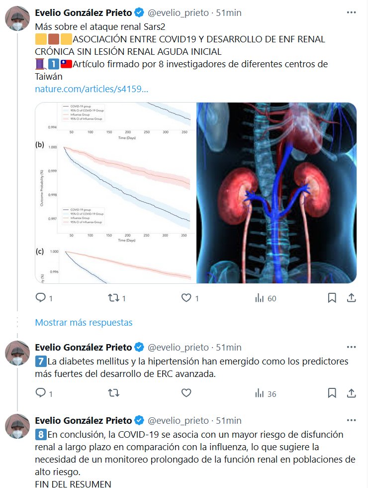 DR. Evelio González Prieto @evelio_prieto · 50min Más sobre el ataque renal Sars2 🟨🟫🟨ASOCIACIÓN ENTRE COVID19 Y DESARROLLO DE ENF RENAL CRÓNICA SIN LESIÓN RENAL AGUDA INICIAL 🧵1⃣🇹🇼Artículo firmado por 8 investigadores de diferentes centros de Taiwán
