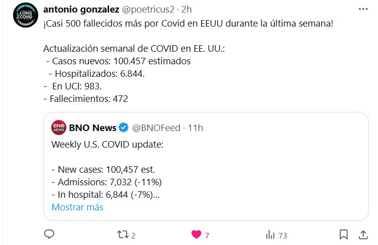 VA BAJANDO EL Nº, A PRINCIPIOS DE AÑO ERAN EL DOBLE, PERO TAMPOCO SABEMOS SI LAS CIFRAS SON CIERTAS ¡Casi 500 fallecidos más por Covid en EEUU durante la última semana! Actualización semanal de COVID en EE. UU.: – Casos nuevos: 100.457 estimados – Hospitalizados: 6.844. – En UCI: 983. – Fallecimientos: 472