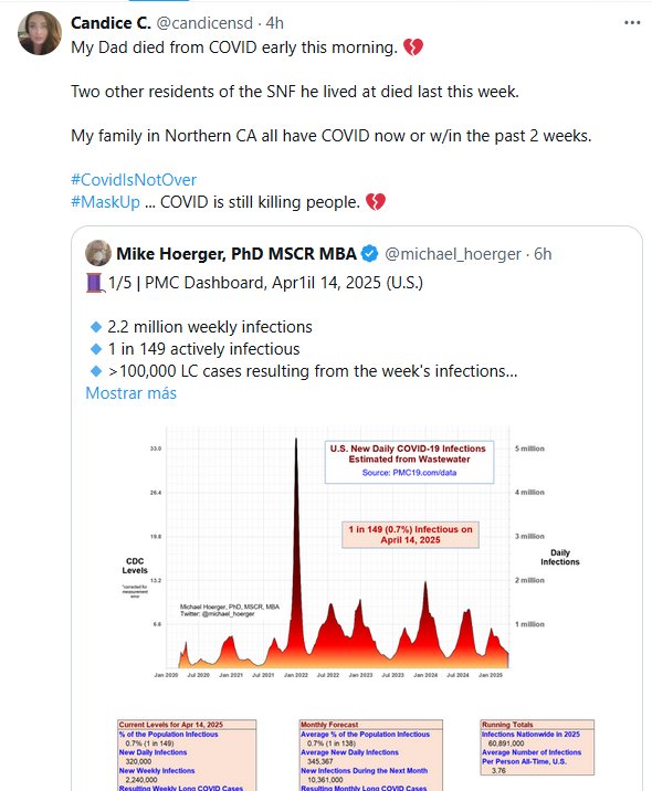 TESTIMONIOS Candice C. @candicensd Mi papá falleció de COVID esta mañana temprano. 💔 Otros dos residentes del centro de enfermería especializada donde vivía fallecieron esta semana. Mi familia en el norte de California tiene COVID ahora o en las últimas dos semanas. #ElCovidNoHaTerminado #UsaMascarillas… El COVID sigue matando gente. 💔
