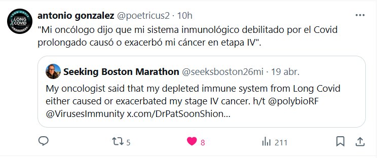 TESTIMONIOS «Mi oncólogo dijo que mi sistema inmunológico debilitado por el Covid prolongado causó o exacerbó mi cáncer en etapa IV». Posted on abril 20, 2025 por coronado