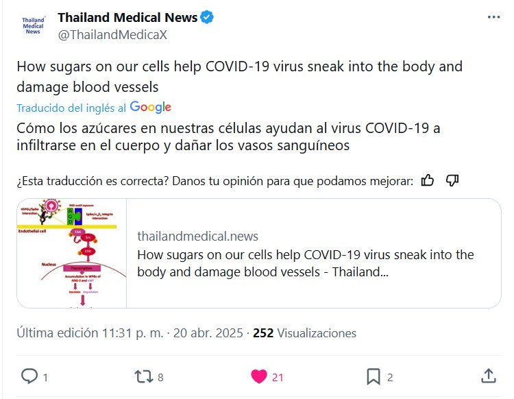 Cómo los azúcares en nuestras células ayudan al virus COVID-19 a infiltrarse en el cuerpo y dañar los vasos sanguíneos Posted on abril 21, 2025 por coronado