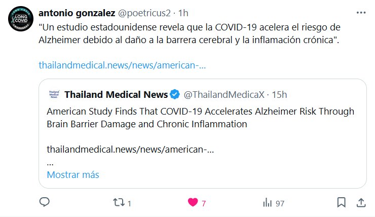 «Un estudio estadounidense revela que la COVID-19 acelera el riesgo de Alzheimer debido al daño a la barrera cerebral y la inflamación crónica» Posted on abril 21, 2025 por coronado https://www.thailandmedical.news/news/american-study-finds-that-covid-19-accelerates-alzheimer-risk-through-brain-barrier-damage-and-chronic-inflammation