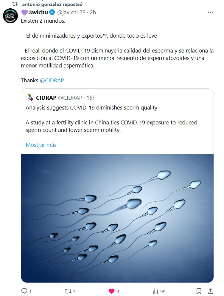GENERACIONES DESTRUIDAS Existen 2 mundos: – El de minimizadores y expertos™, donde todo es leve – El real, donde el COVID-19 disminuye la calidad del esperma y se relaciona la exposición al COVID-19 con un menor recuento de espermatozoides y una menor motilidad espermática.
