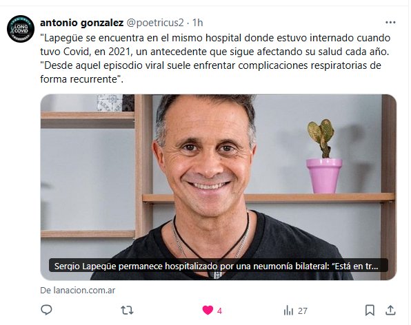 Antonio GonzÁlez @poetricus2 · «Lapegüe se encuentra en el mismo hospital donde estuvo internado cuando tuvo Covid, en 2021, un antecedente que sigue afectando su salud cada año. «Desde aquel episodio viral suele enfrentar complicaciones respiratorias de forma recurrente»