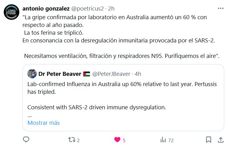 Antonio González @poetricus2 · «La gripe confirmada por laboratorio en Australia aumentó un 60 % con respecto al año pasado. La tos ferina se triplicó. En consonancia con la desregulación inmunitaria provocada por el SARS-2. Necesitamos ventilación, filtración y respiradores N95. Purifiquemos el aire».