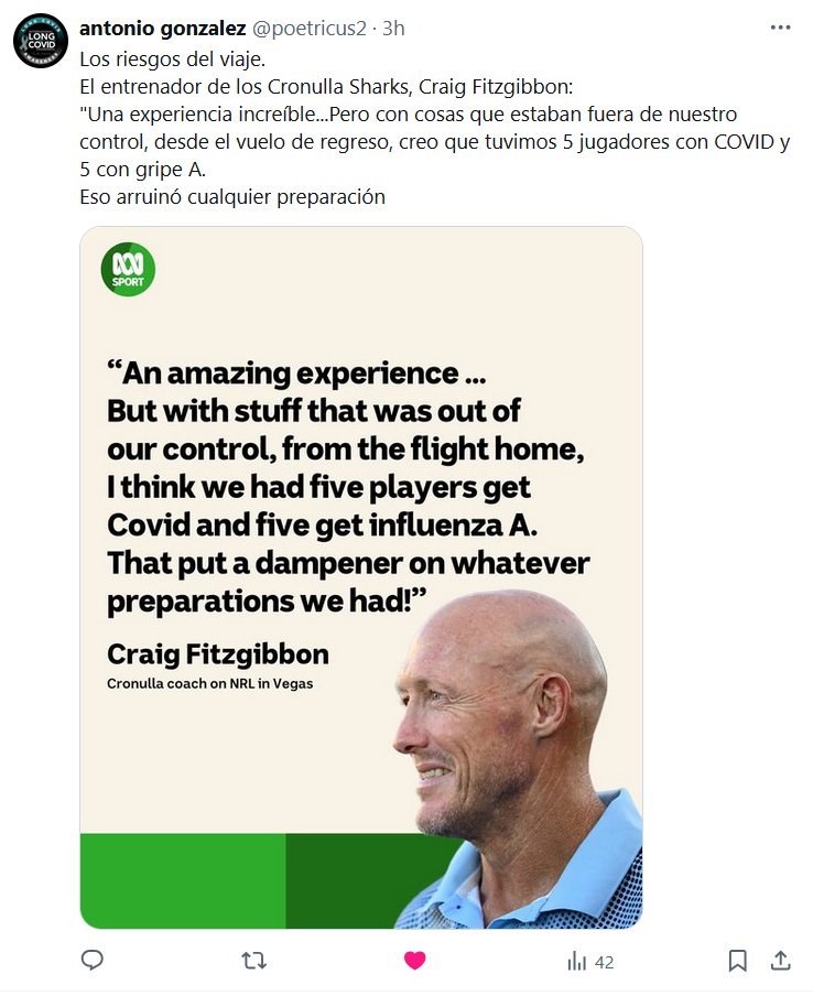 «FIN DE PANDEMIA» ABRIL 2025 Antonio González @poetricus2 Los riesgos del viaje. El entrenador de los Cronulla Sharks, Craig Fitzgibbon: «Una experiencia increíble…Pero con cosas que estaban fuera de nuestro control, desde el vuelo de regreso, creo que tuvimos 5 jugadores con COVID y 5 con gripe A. Eso arruinó cualquier preparación