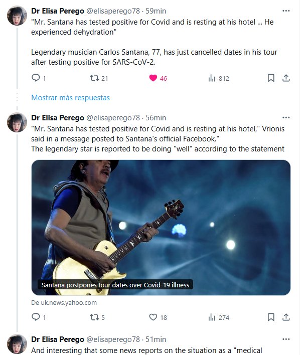 «FIN DE PANDEMIA» Dra. Elisa Perego @elisaperego7 «El Sr. Santana dio positivo por Covid y se encuentra descansando en su hotel… Presentó deshidratación». El legendario músico Carlos Santana, de 77 años, acaba de cancelar fechas de su gira tras dar positivo por SARS-CoV-2.