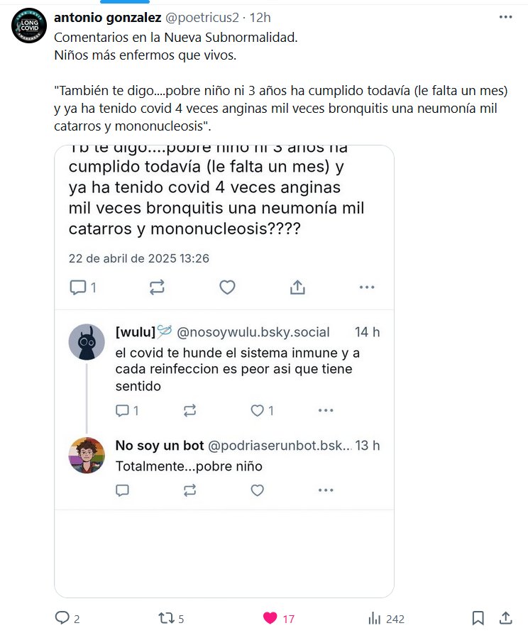 LESA HUMANIDAD Antonio González @poetricus2 · Comentarios en la Nueva Subnormalidad. Niños más enfermos que vivos. «También te digo….pobre niño ni 3 años ha cumplido todavía (le falta un mes) y ya ha tenido covid 4 veces anginas mil veces bronquitis una neumonía mil catarros y mononucleosis».