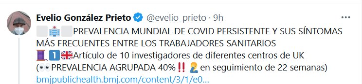 DR. Evelio González Prieto @evelio_prieto · ⬜️🏥⬜️PREVALENCIA MUNDIAL DE COVID PERSISTENTE Y SUS SÍNTOMAS MÁS FRECUENTES ENTRE LOS TRABAJADORES SANITARIOS 🧵1⃣🇬🇧Artículo de 10 investigadores de diferentes centros de UK (👀PREVALENCIA AGRUPADA 40%‼️🤦♂️en seguimiento de 22 semanas)