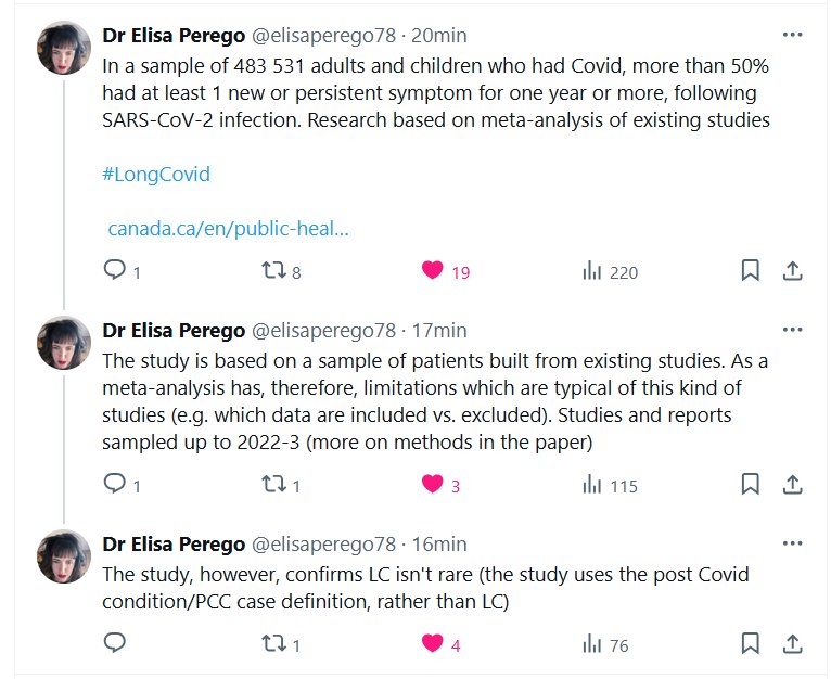 Dra. Elisa Perego @elisaperego78 En una muestra de 483 531 adultos y niños con COVID-19, más del 50 % presentó al menos un síntoma nuevo o persistente durante un año o más tras la infección por SARS-CoV-2. Investigación basada en un metaanálisis de estudios existentes. #CovidProlongado