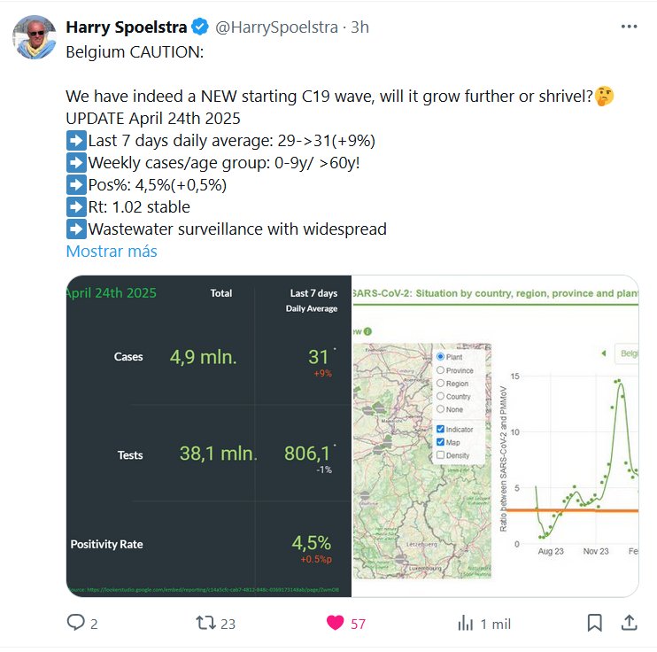 DR. Harry Spoelstra @HarrySpoelstra · Bélgica. PRECAUCIÓN: Tenemos una NUEVA ola de COVID-19, ¿crecerá más o disminuirá? 🤔 ACTUALIZACIÓN: 24 de abril de 2025 ➡️ Promedio diario de los últimos 7 días: 29->31 (+9%) ➡️ Casos semanales/grupo de edad: 0-9 años/>60 años!