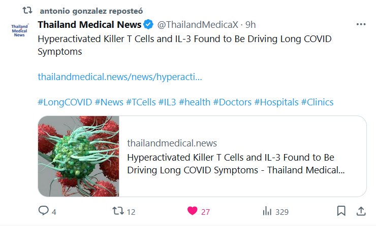 Se descubre que las células T asesinas hiperactivadas y la IL-3 impulsan los síntomas prolongados de COVID-19 Posted on abril 25, 2025 por coronado https://www.thailandmedical.news/news/hyperactivated-killer-t-cells-and-il-3-found-to-be-driving-long-covid-symptoms