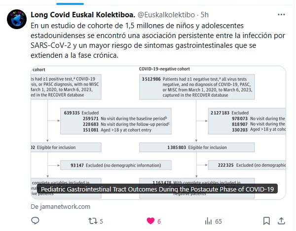Long Covid Euskal Kolektiboa. @Euskalkolektibo · En un estudio de cohorte de 1,5 millones de niños y adolescentes estadounidenses se encontró una asociación persistente entre la infección por SARS-CoV-2 y un mayor riesgo de sintomas gastrointestinales que se extienden a la fase crónica.