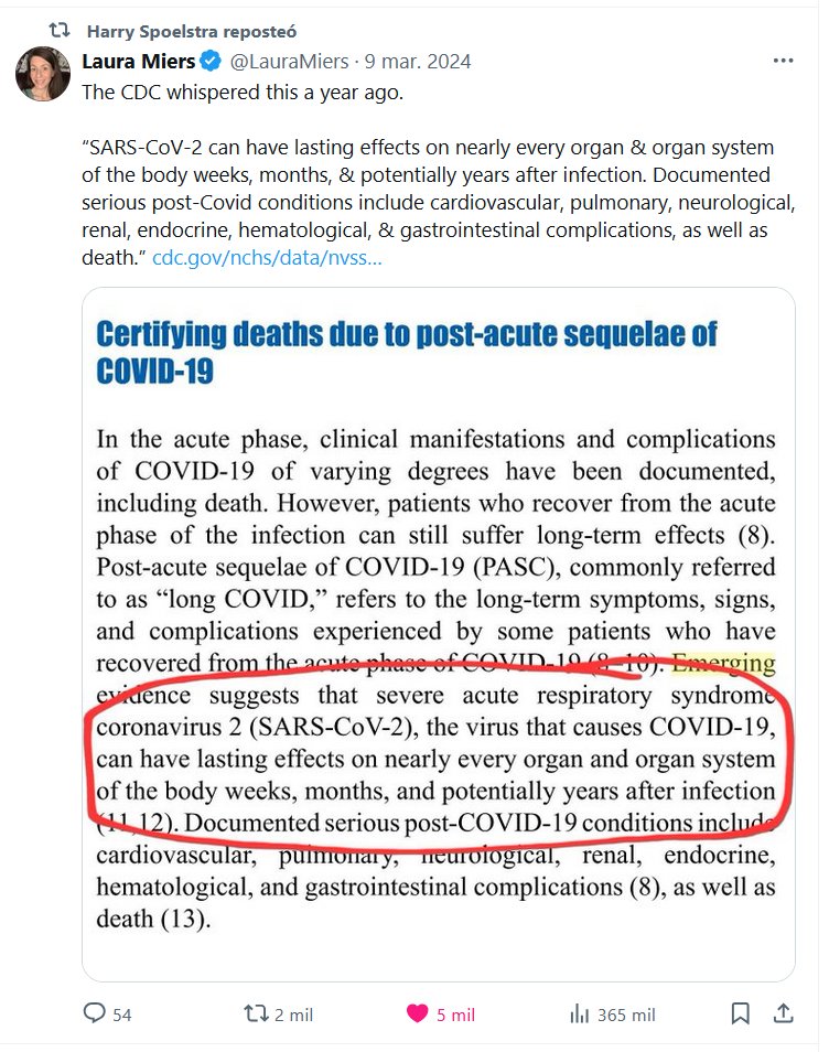 ACÁ GRITAMOS LO QUE ELLOS SUSURRAN Laura Miers @LauraMiers ·9 mar. 2024 Los CDC lo susurraron hace un año: “El SARS-CoV-2 puede tener efectos duraderos en casi todos los órganos y sistemas del cuerpo semanas, meses e incluso años después de la infección. Las afecciones graves documentadas después de la COVID-19 incluyen complicaciones cardiovasculares, pulmonares, neurológicas, renales, endocrinas, hematológicas y gastrointestinales, así como la muerte”