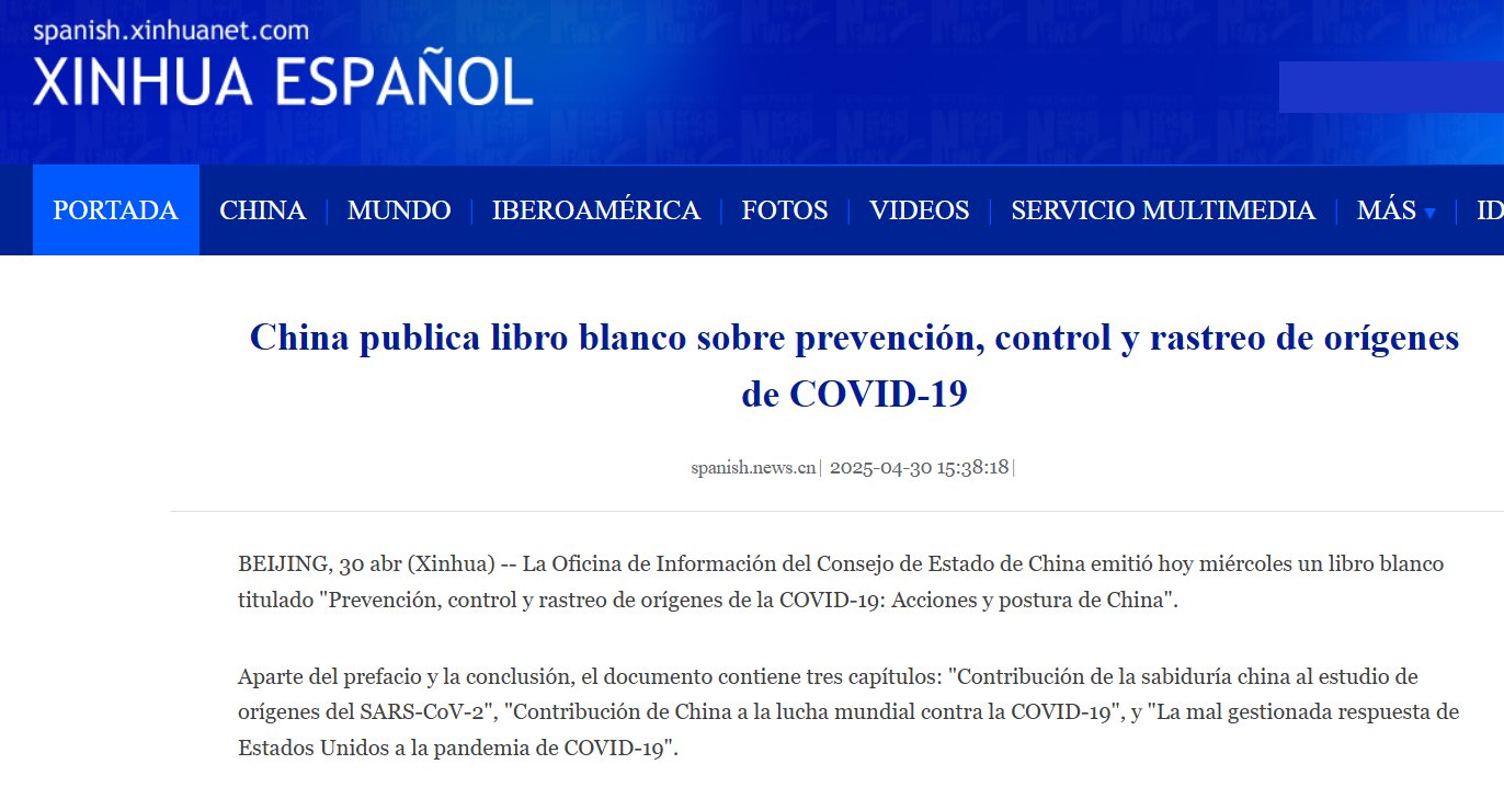 China publica libro blanco sobre prevención, control y rastreo de orígenes de COVID-19 Posted on abril 30, 2025 por coronado https://spanish.xinhuanet.com/20250430/27cf97e0cfa3486da0a796b2cd6b84f1/c.html