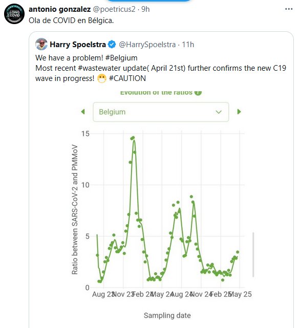 Prof. Antonio González @poetricus2 Ola COVID en Bélgica. Cita al Dr. Harry Spoelstra @HarrySpoelstra ¡Tenemos un problema! #Bélgica La última actualización sobre #aguasresiduales (21 de abril) confirma una nueva ola de COVID-19 en curso. 😷 #PRECAUCIÓN