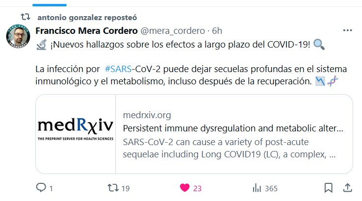 Francisco Mera Cordero @mera_cordero · 🔬 ¡Nuevos hallazgos sobre los efectos a largo plazo del COVID-19! 🔍 La infección por #SARS-CoV-2 puede dejar secuelas profundas en el sistema inmunológico y el metabolismo, incluso después de la recuperación. 📉🧬