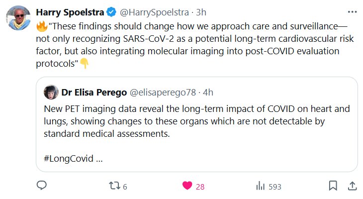 DR. Harry Spoelstra @HarrySpoelstra 🔥»Estos hallazgos deberían cambiar nuestra forma de abordar la atención y la vigilancia, no solo reconociendo el SARS-CoV-2 como un posible factor de riesgo cardiovascular a largo plazo, sino también integrando la imagenología molecular en los protocolos de evaluación post-COVID».👇