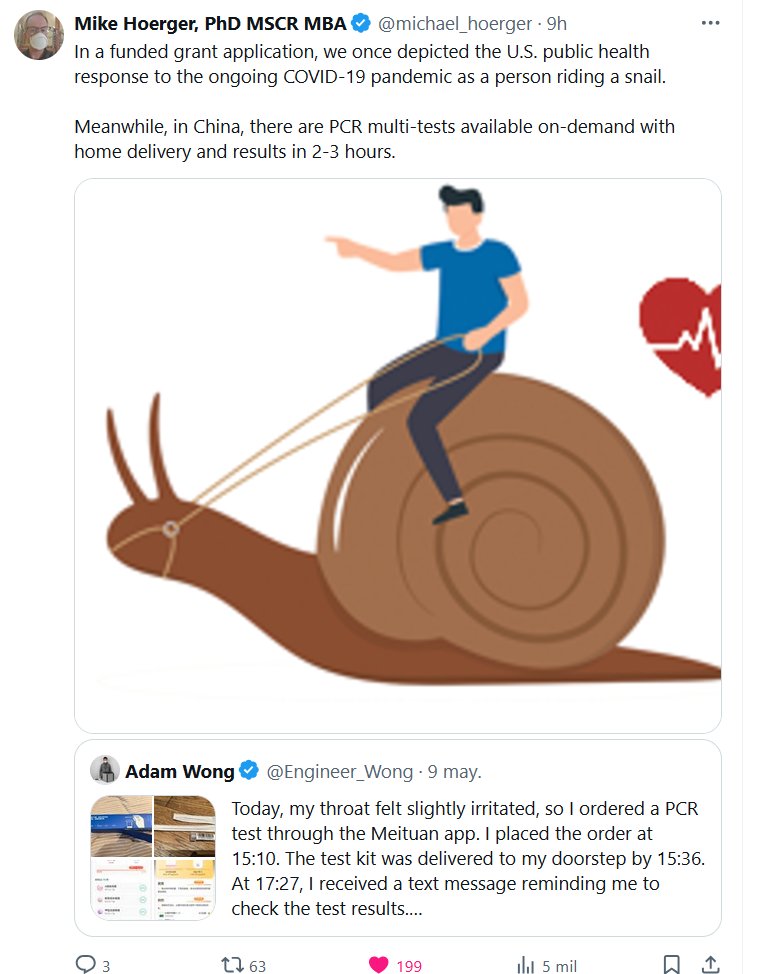 Mike Hoerger, PhD MSCR MBA @michael_hoerger En una solicitud de subvención financiada, describimos la respuesta de salud pública de EE. UU. a la pandemia de COVID-19 como una persona montada en un caracol. Mientras tanto, en China, existen pruebas PCR múltiples disponibles a pedido con entrega a domicilio y resultados en 2-3 horas.