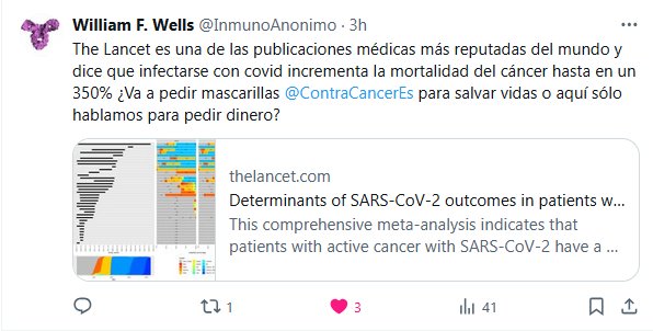 William F. Wells @InmunoAnonimo · The Lancet es una de las publicaciones médicas más reputadas del mundo y dice que infectarse con covid incrementa la mortalidad del cáncer hasta en un 350% ¿Va a pedir mascarillas @ContraCancerEs para salvar vidas o aquí sólo hablamos para pedir dinero?