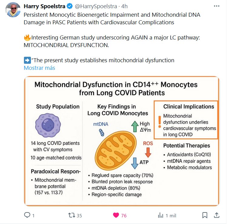 DR. Harry Spoelstra @HarrySpoelstra Deterioro bioenergético monocítico persistente y daño del ADN mitocondrial en pacientes con PASC y complicaciones cardiovasculares 🔥Interesante estudio alemán que destaca una vez más una vía importante de LC: la disfunción mitocondrial