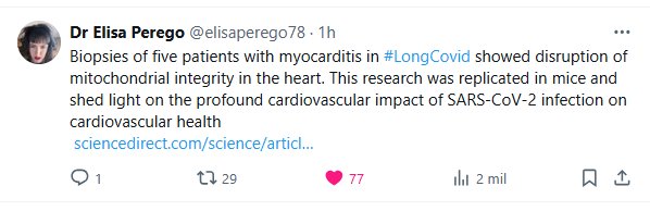 Las biopsias de cinco pacientes con miocarditis en #CovidPersistente mostraron una alteración de la integridad mitocondrial cardíaca. Esta investigación se replicó en ratones y arrojó luz sobre el profundo impacto cardiovascular de la infección por SARS-CoV-2 en la salud cardiovascular.