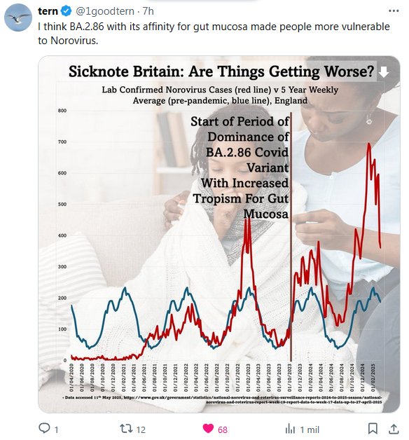 POR FIN UN VERDADERO PENSAMIENTO CIENTÍFICO, POR FIN UNA TEORÍA! Creo que BA.2.86 con su afinidad por la mucosa intestinal hizo que las personas fueran más vulnerables al norovirus. Posted on mayo 11, 2025 por coronado