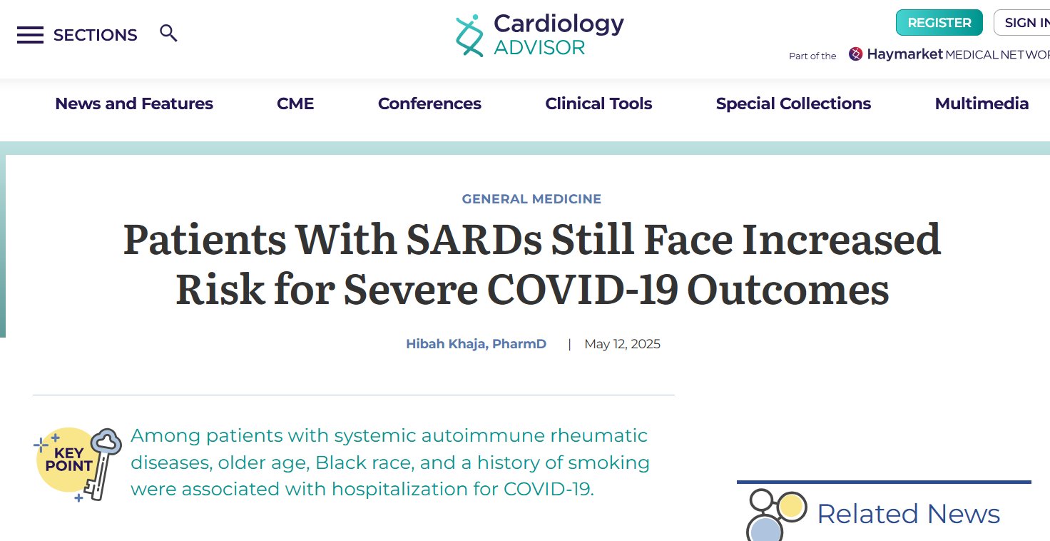 The Cardiology Advisor – 12/05/2025 Los pacientes con SARD aún enfrentan un mayor riesgo de presentar resultados graves de COVID-19 Posted on mayo 12, 2025 por coronado https://www.thecardiologyadvisor.com/news/sards-linked-to-hospitalization-for-covid19/